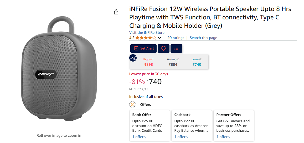 iNFiRe Fusion 12W Wireless Portable Speaker Upto 8 Hrs Playtime with TWS Function, BT connectivity, Type C Charging & Mobile Holder (Grey) is available on Amazon.