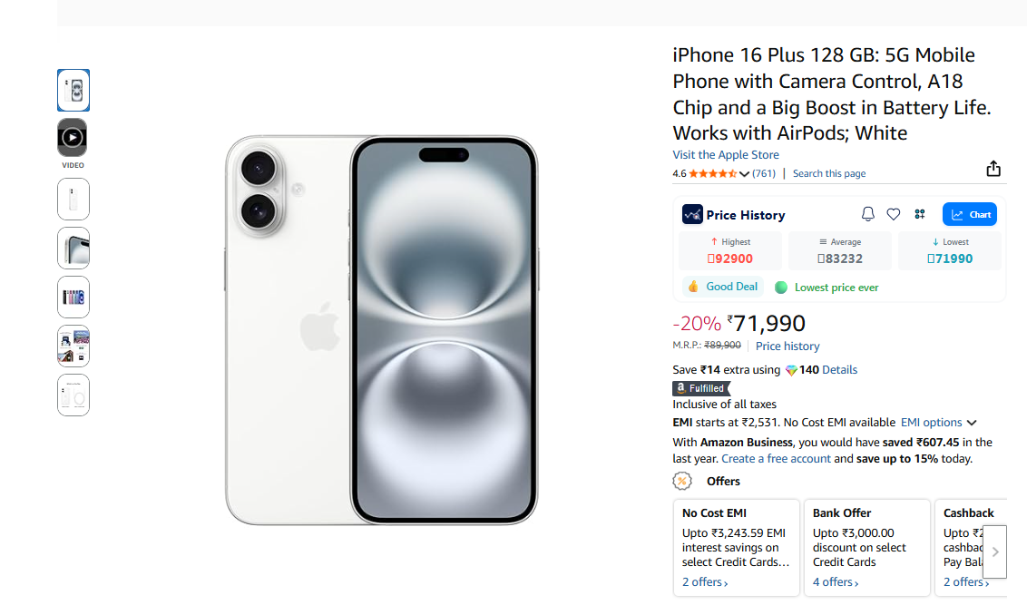 iPhone 16 Plus 128 GB: 5G Mobile Phone with Camera Control, A18 Chip and a Big Boost in Battery Life. Works with AirPods; White