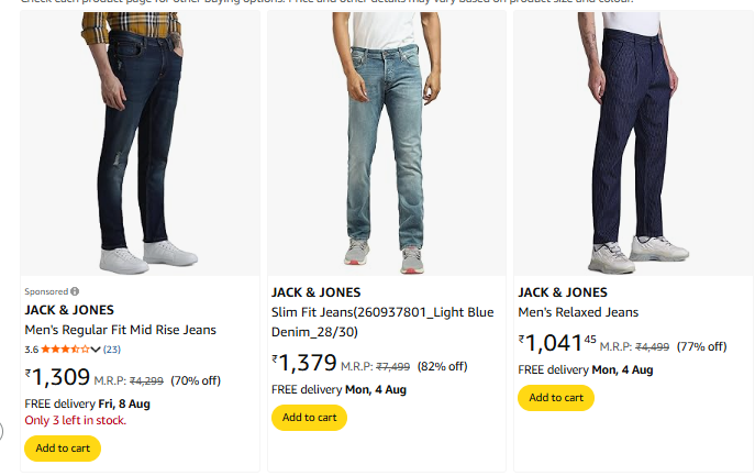 JACK & JONES Men Jeans Minimum 70% Discount available online in India (80% discount from MRP) on Amazon. Discount: 80%. This deal was updated by @nandkishor on 01st August, 2025 at 3:39 PM.