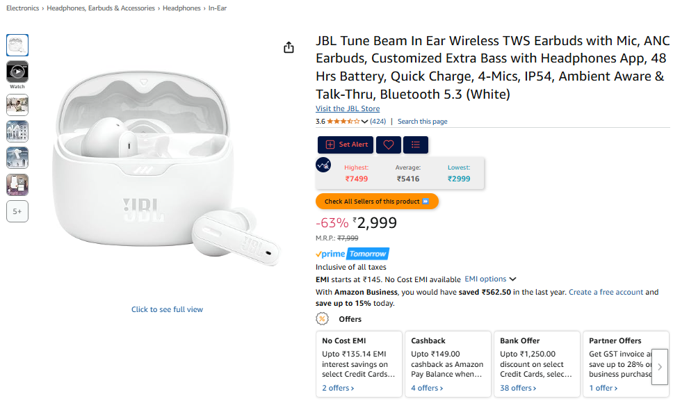JBL Tune Beam In Ear Wireless TWS Earbuds with Mic, ANC Earbuds, Customized Extra Bass with Headphones App, 48 Hrs Battery, Quick Charge, 4-Mics, IP54, Ambient Aware & Talk-Thru, Bluetooth 5.3 (White).