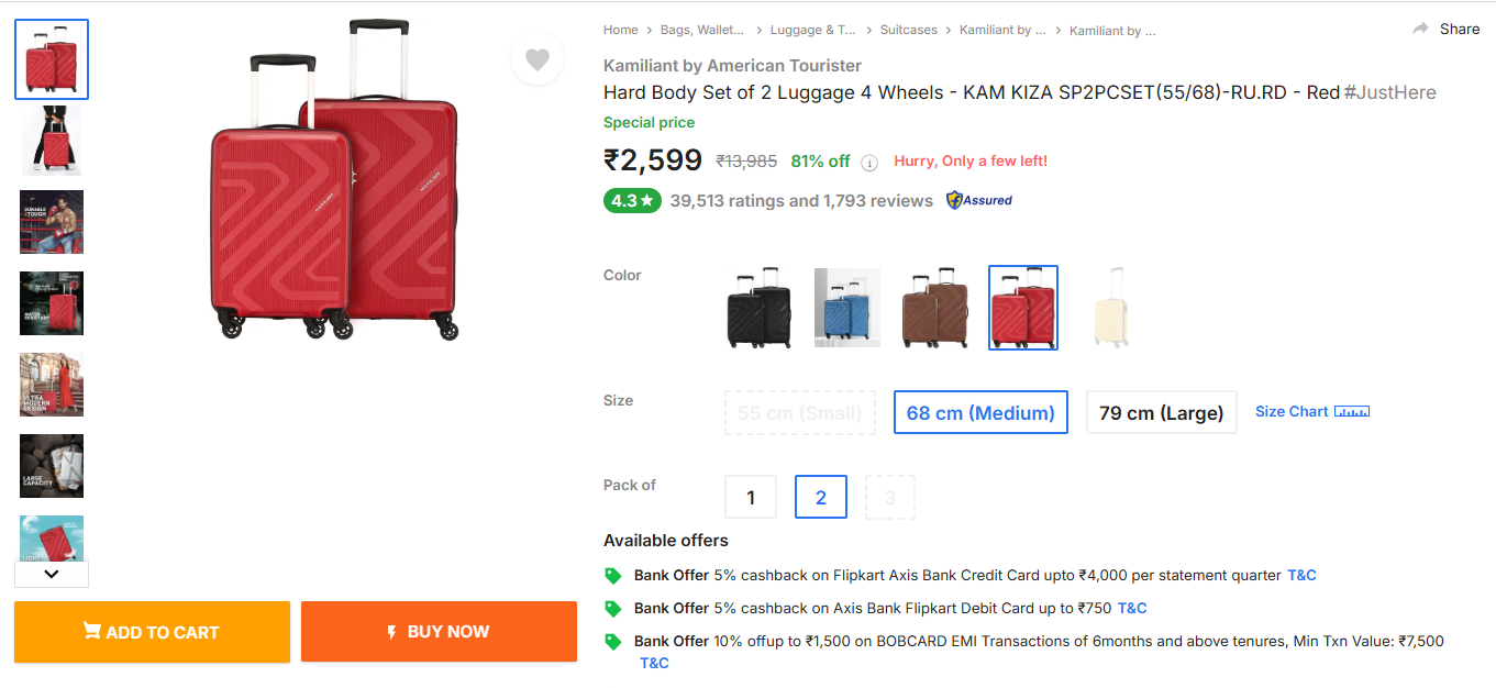 Kamiliant by American Tourister Hard Body Set of 2 Luggage 4 Wheels - KAM KIZA SP2PCSET(55/68)-RU.RD - Red.