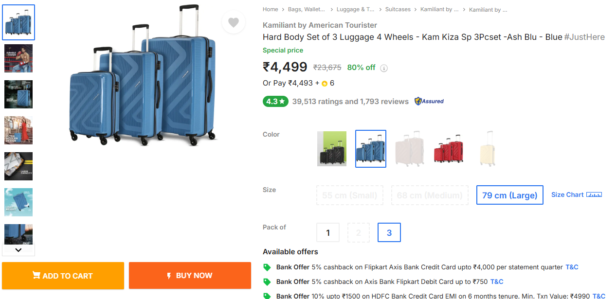 Kamiliant by American Tourister Hard Body Set of 3 Luggage 4 Wheels - Kam Kiza Sp 3Pcset -Ash Blu - Blue.
