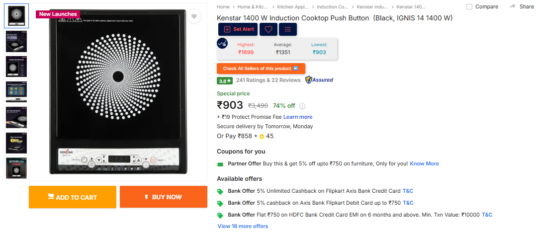 Kenstar 1400 W Induction Cooktop Push Button (Black, IGNIS 14 1400 W).