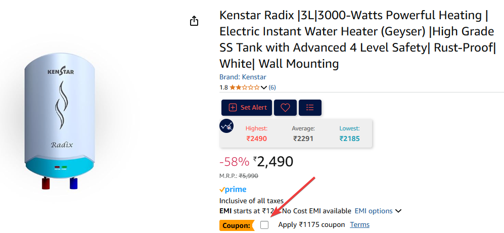 Kenstar Radix | 3L | 3000-Watts Powerful Heating | Electric Instant Water Heater (Geyser) |High Grade SS Tank with Advanced 4 Level Safety| Rust-Proof| White| Wall Mounting