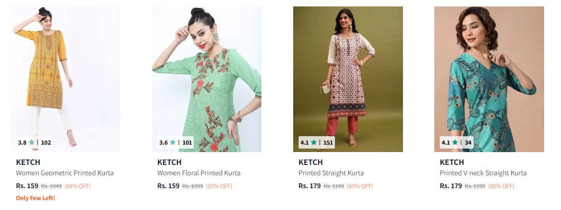 Ketch Women's Kurta upto 85% Discount | Starting at ₹159 available online in India at an offer price of ₹159 on Myntra. Discounted Price: ₹159. This deal was updated by @radhika on 26th October, 2025 at 1:59 PM.