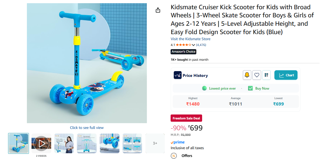 Kidsmate Cruiser Kick Scooter for Kids with Broad Wheels | 3-Wheel Skate Scooter for Boys & Girls of Ages 2-12 Years | 5-Level Adjustable Height, and Easy Fold Design Scooter for Kids (Blue)