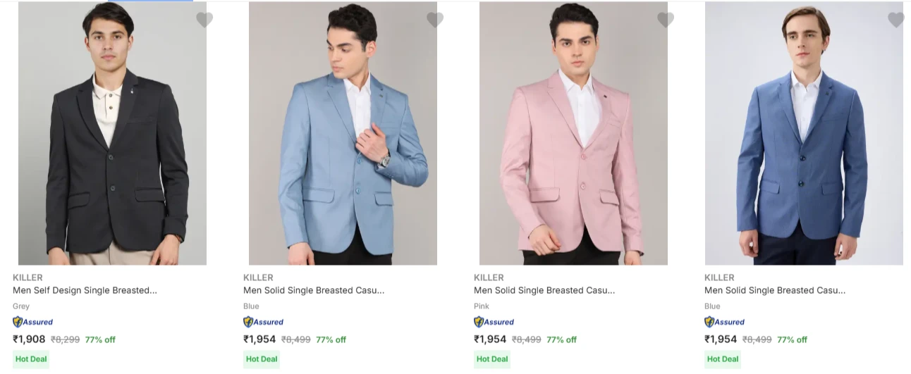 Killer Men's Readymade Blazers at minimum 70% Discount is available online in India (70% off) on Flipkart.
