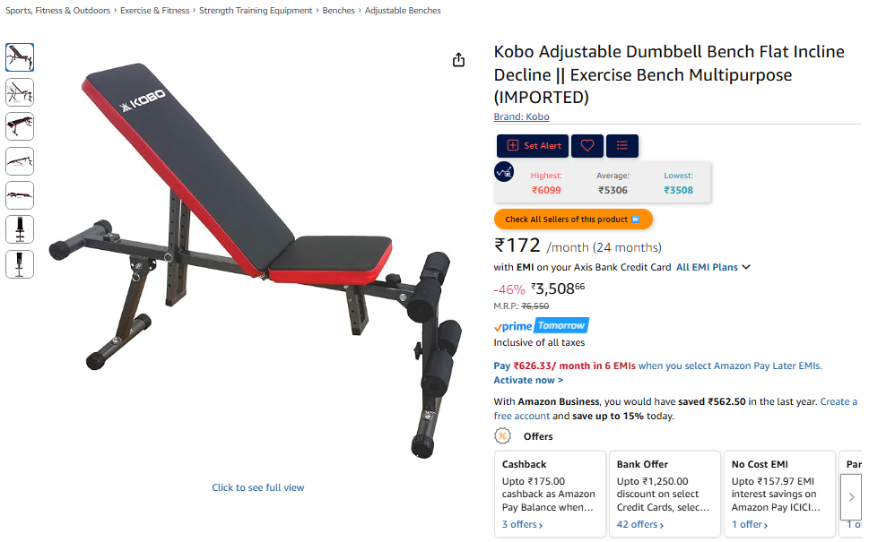 Kobo Adjustable Dumbbell Bench Flat Incline Decline || Exercise Bench Multipurpose (IMPORTED).