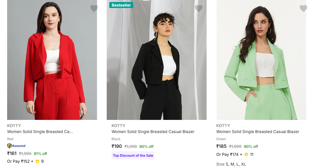Kotty Women's Blazers upto 91% Discount | Starting at ₹161 is available on Flipkart.