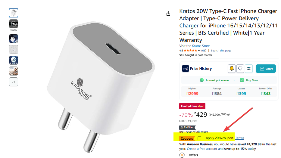 Kratos 20W Type-C Fast iPhone Charger Adapter | Type-C Power Delivery Charger for iPhone 16/15/14/13/12/11 Series | BIS Certified | White|1 Year Warranty