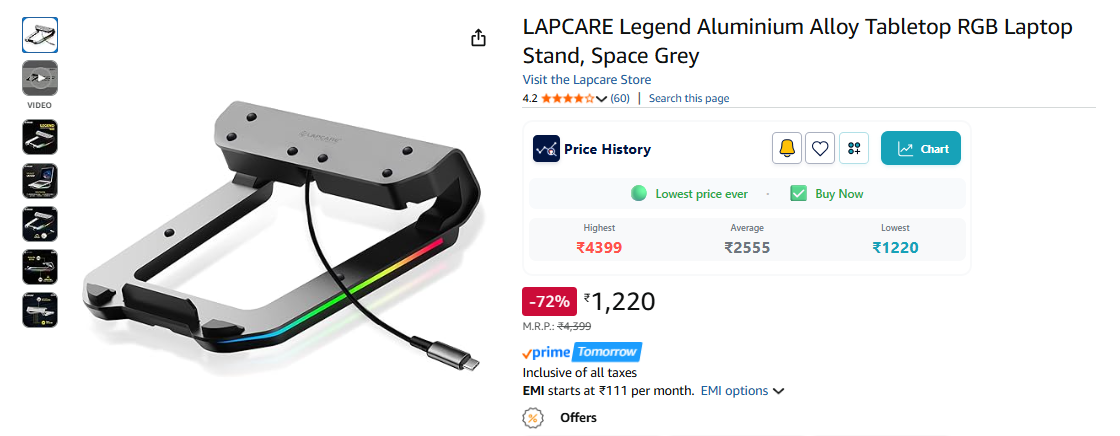 LAPCARE Legend Aluminium Alloy Tabletop RGB Laptop Stand, Space Grey.