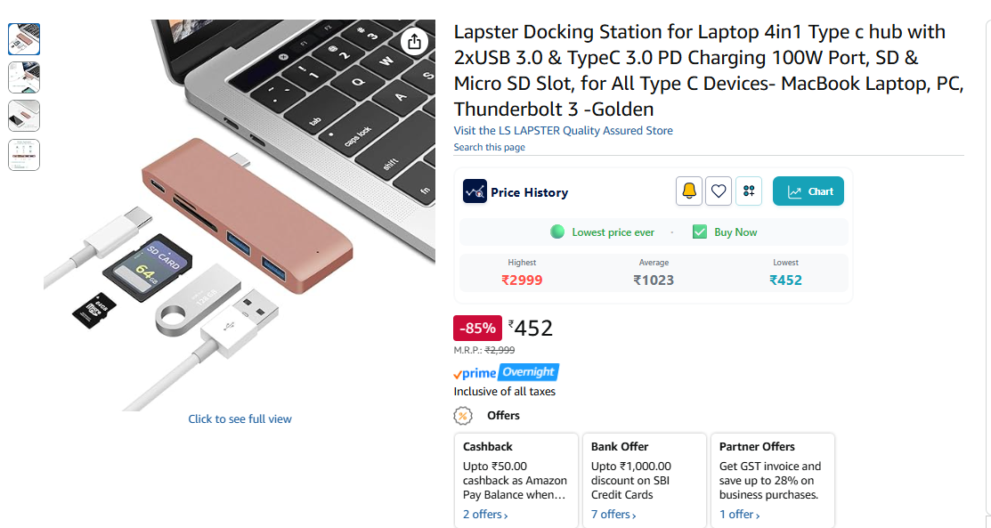 Lapster Docking Station for Laptop 4in1 Type c hub with 2xUSB 3.0 & TypeC 3.0 PD Charging 100W Port, SD & Micro SD Slot, for All Type C Devices- MacBook Laptop, PC, Thunderbolt 3 -Golden
