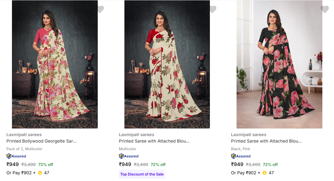 Laxmipati Sarees Women's Sarees upto 72% Discount available online in India on Flipkart. This deal was updated by @radhika on 05th October, 2025 at 7:33 PM.