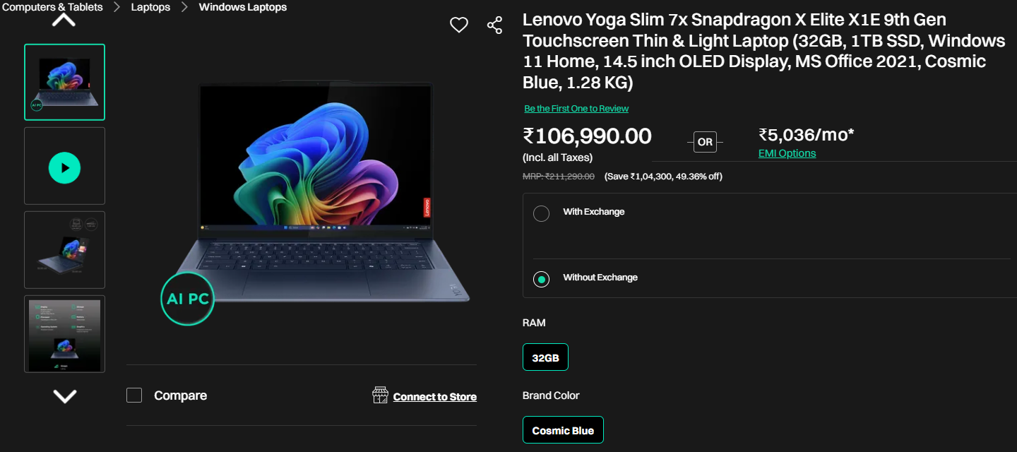 Lenovo Yoga Slim 7x Snapdragon X Elite X1E 9th Gen Touchscreen Thin & Light Laptop (32GB, 1TB SSD, Windows 11 Home, 14.5 inch OLED Display, MS Office 2021, Cosmic Blue, 1.28 KG).