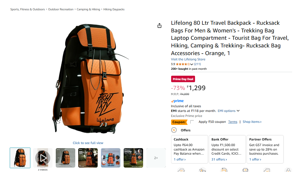Lifelong 80 Ltr Travel Backpack - Rucksack Bags For Men & Women's - Trekking Bag Laptop Compartment - Tourist Bag For Travel, Hiking, Camping & Trekking- Rucksack Bag Accessories - Orange, 1