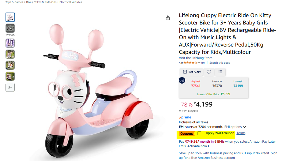 Lifelong Cuppy Electric Ride On Kitty Scooter Bike for 3+ Years Baby Girls |Electric Vehicle|6V Rechargeable Ride-On with Music,Lights & AUX|Forward/Reverse Pedal,50Kg Capacity for Kids,Multicolour
