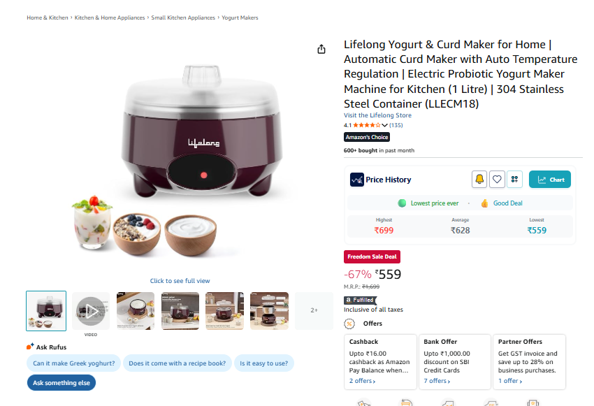 Lifelong Yogurt & Curd Maker for Home | Automatic Curd Maker with Auto Temperature Regulation | Electric Probiotic Yogurt Maker Machine for Kitchen (1 Litre) | 304 Stainless Steel Container (LLECM18)