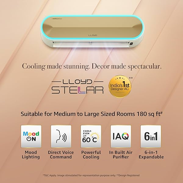 Lloyd Stellar 1.5 Ton 5 Star Wi-Fi Inverter Split AC (6 in 1 Expandable, Mood Lighting, In-Built Air Purifier, Direct Voice Command, Copper, White/Golden, GLS18V5FWGST, FREE INSTALLATION*).