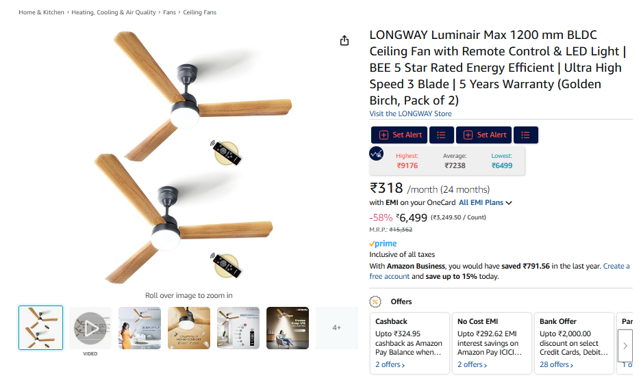 LONGWAY Luminair Max 1200 mm BLDC Ceiling Fan with Remote Control & LED Light | BEE 5 Star Rated Energy Efficient | Ultra High Speed 3 Blade | 5 Years Warranty (Golden Birch, Pack of 2).