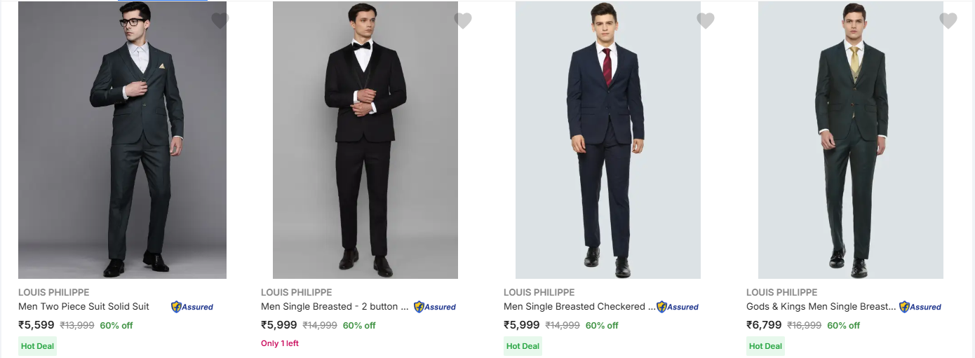 Louis Philippe Men's Readymade Suits at Minimum 60% Discount is available online in India on Flipkart.