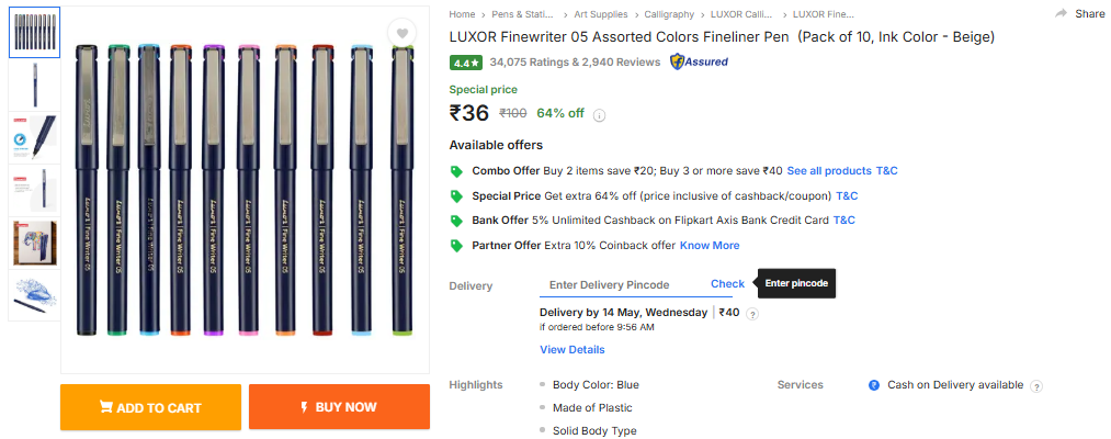 LUXOR Finewriter 05 Assorted Colors Fineliner Pen (Pack of 10, Ink Color - Beige).