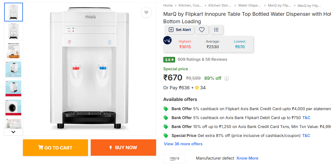 MarQ by Flipkart Innopure Table Top Bottled Water Dispenser with Hot and Normal No Cold Water Bottom Loading
