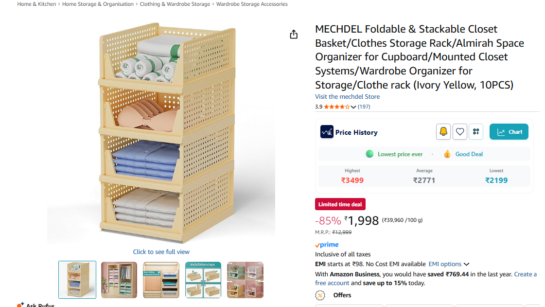 MECHDEL Foldable & Stackable Closet Basket /Clothes Storage Rack /Almirah Space Organizer for Cupboard /Mounted Closet Systems /Wardrobe Organizer for Storage /Clothe rack (Ivory Yellow, 10PCS)