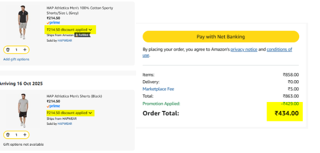 Men's Shorts Buy 1 Get 1 Free available online in India on Amazon. Offer Note: Get 2 for the price of 1. This deal was updated by @latika on 08th October, 2025 at 12:03 PM.