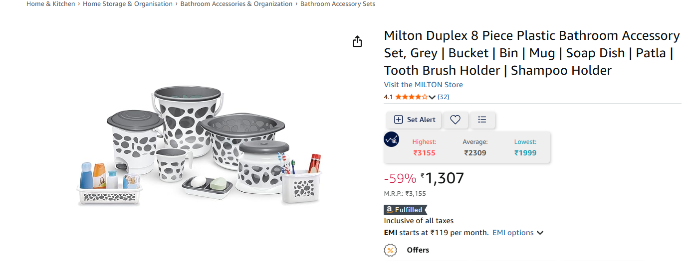 Milton Duplex 8 Piece Plastic Bathroom Accessory Set, Grey | Bucket | Bin | Mug | Soap Dish | Patla | Tooth Brush Holder | Shampoo Holder