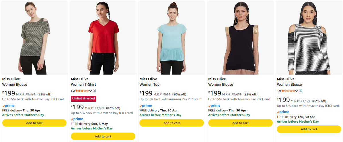 Miss Olive Women's Top Starting @ ₹199 is available online in India on Amazon.