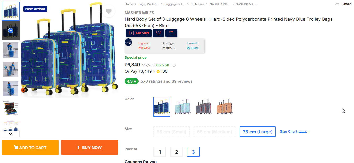 NASHER MILES Hard Body Set of 3 Luggage 8 Wheels - Hard-Sided Polycarbonate Printed Navy Blue Trolley Bags (55,65&75cm) - Blue.