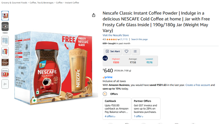 Nescafe Classic Instant Coffee Powder | Indulge in a delicious NESCAFE Cold Coffee at home | Jar with Free Frosty Cafe Glass Inside | 190g/180g Jar (Weight May Vary).