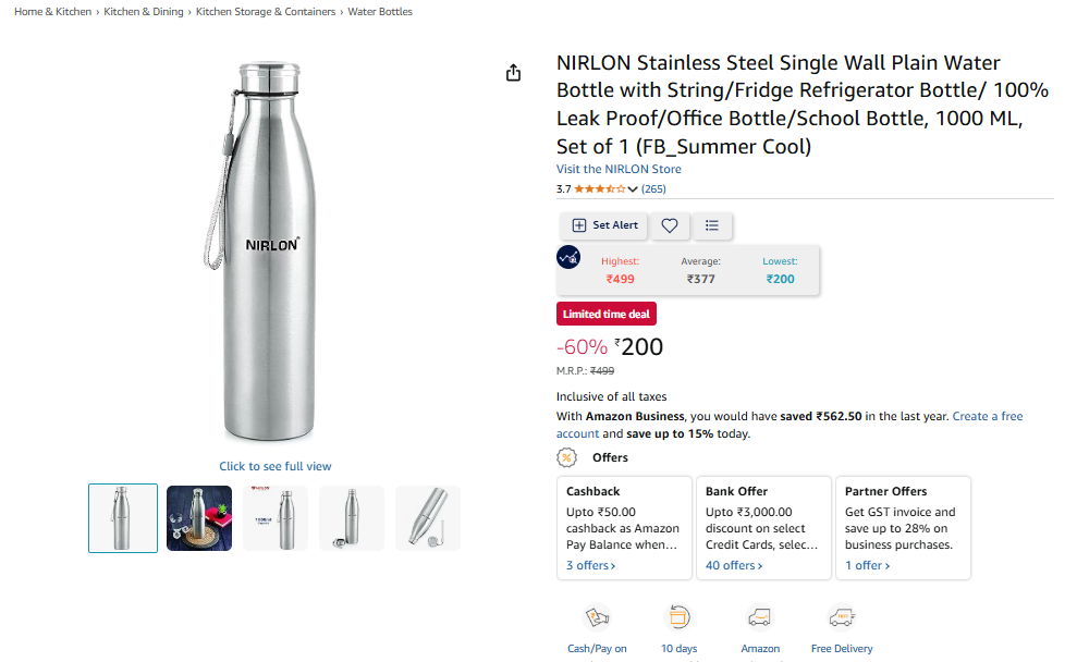 NIRLON Stainless Steel Single Wall Plain Water Bottle with String/Fridge Refrigerator Bottle/ 100% Leak Proof/Office Bottle/School Bottle, 1000 ML, Set of 1 (FB_Summer Cool).