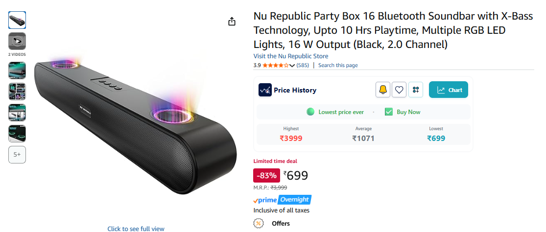 Nu Republic Party Box 16 Bluetooth Soundbar with X-Bass Technology, Upto 10 Hrs Playtime, Multiple RGB LED Lights, 16 W Output (Black, 2.0 Channel) is available on Amazon.
