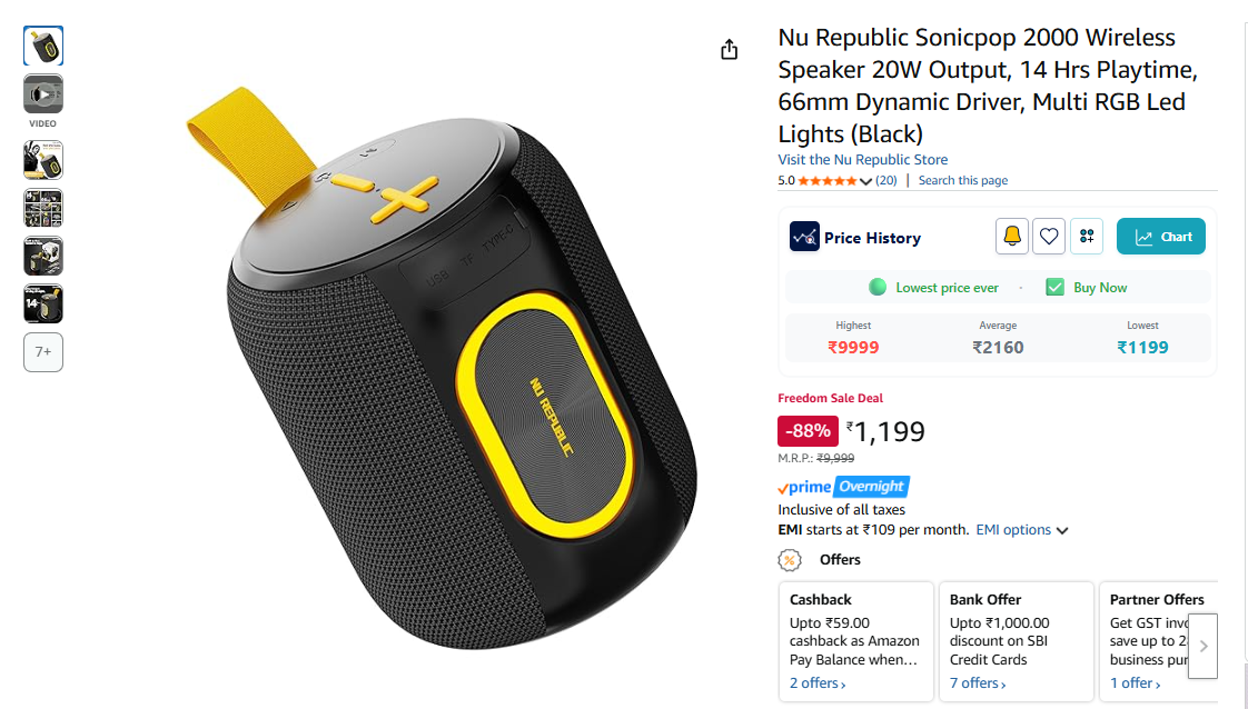 Nu Republic Sonicpop 2000 Wireless Speaker 20W Output, 14 Hrs Playtime, 66mm Dynamic Driver, Multi RGB Led Lights (Black).