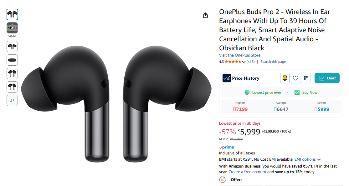 OnePlus Buds Pro 2 - Wireless Earphones with up to 39 Hours of Battery Life, Smart Adaptive Noise Cancellation and Spatial Audio - Obsidian Black is available on Amazon.
