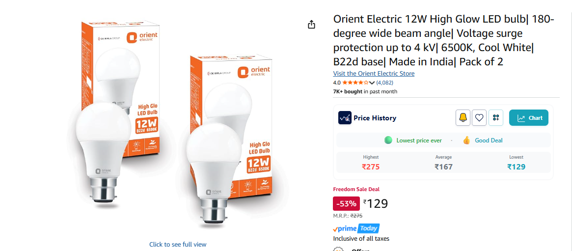 Orient Electric 12W High Glow LED bulb | 180-degree wide beam angle | Voltage surge protection up to 4 kV | 6500K, Cool White | B22d base | Made in India | Pack of 2.