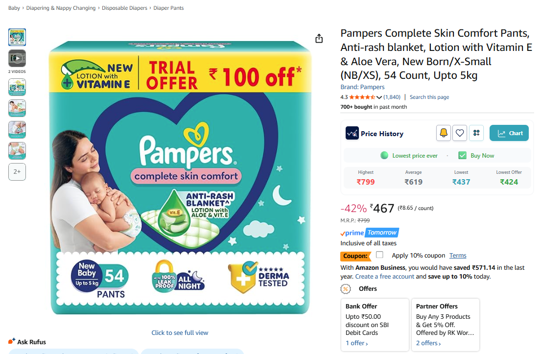 Pampers Complete Skin Comfort Pants, Anti-rash blanket, Lotion with Vitamin E & Aloe Vera, New Born/X-Small (NB/XS), 54 Count, Upto 5kg