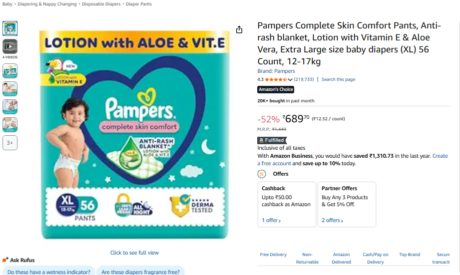 Pampers Complete Skin Comfort Pants, Anti-rash blanket, Lotion with Vitamin E & Aloe Vera, Extra Large size baby diapers (XL) 56 Count, 12-17kg.