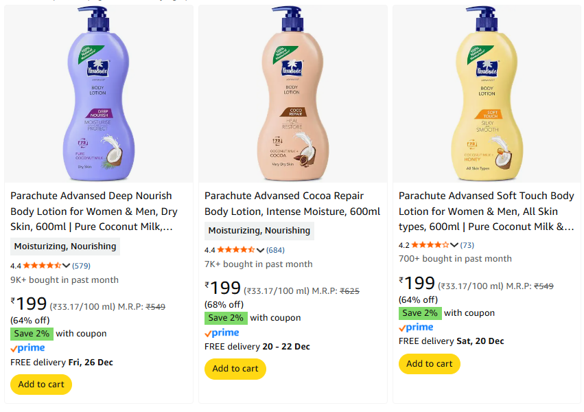 Parachute Advansed Body Lotion 600ml @ ₹195, Available on Amazon.