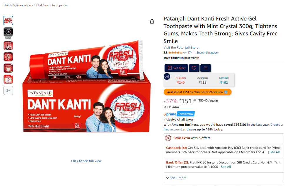 Patanjali Dant Kanti Fresh Active Gel Toothpaste with Mint Crystal 300g, Tightens Gums, Makes Teeth Strong, Gives Cavity Free Smile.