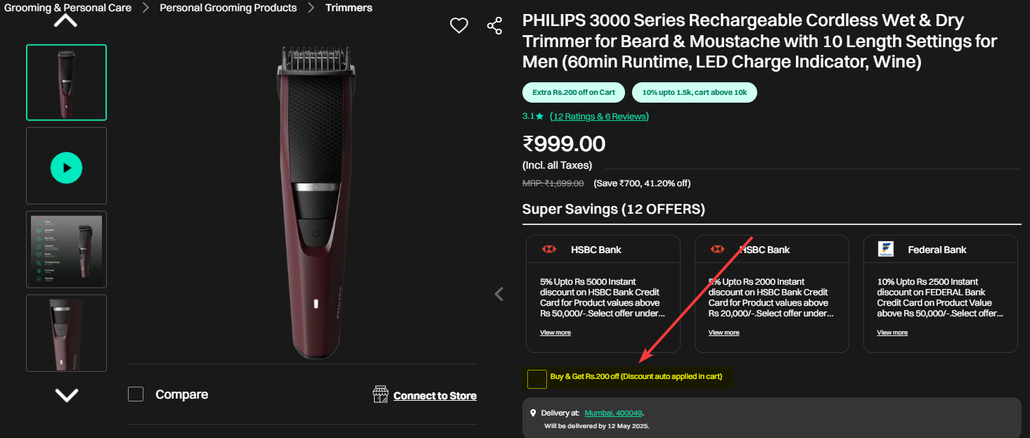 PHILIPS 3000 Series Rechargeable Cordless Wet & Dry Trimmer for Beard & Moustache with 10 Length Settings for Men (60min Runtime, LED Charge Indicator, Wine).