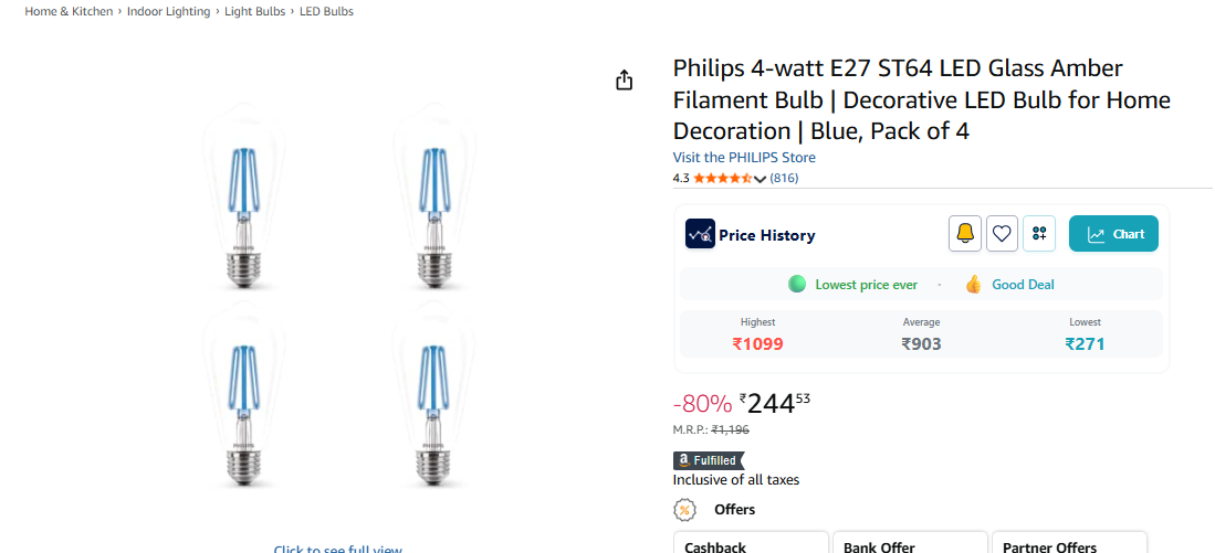 Philips 4-watt E27 ST64 LED Glass Amber Filament Bulb | Decorative LED Bulb for Home Decoration | Blue, Pack of 4