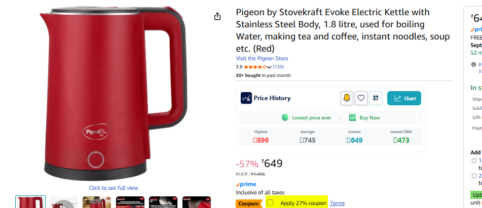 Pigeon by Stovekraft Evoke Electric Kettle with Stainless Steel Body, 1.8 litre, used for boiling Water, making tea and coffee, instant noodles, soup etc. (Red)
