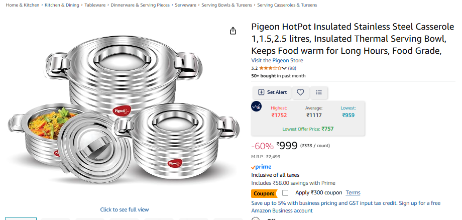 Pigeon HotPot Insulated Stainless Steel Casserole 1,1.5,2.5 litres, Insulated Thermal Serving Bowl, Keeps Food warm for Long Hours, Food Grade.