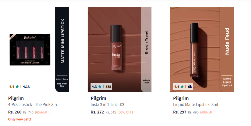 Pilgrim Lipsticks upto 65% Discount is available on Myntra.