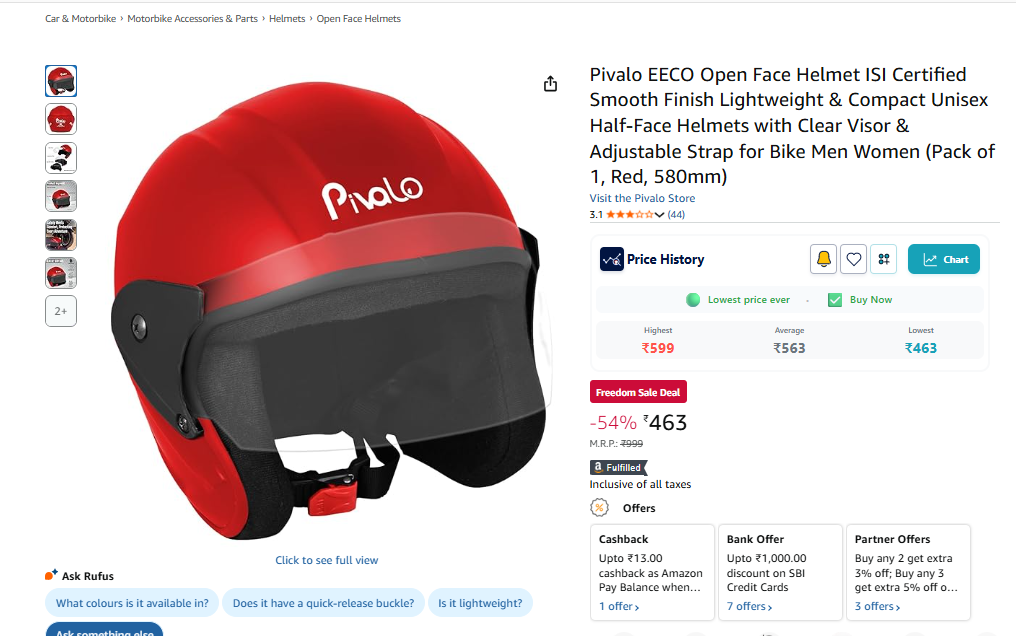 Pivalo EECO Open Face Helmet ISI Certified Smooth Finish Lightweight & Compact Unisex Half-Face Helmets with Clear Visor & Adjustable Strap for Bike Men Women (Pack of 1, Red, 580mm)