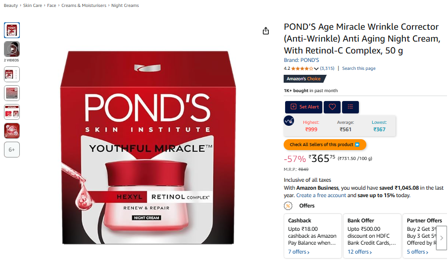 POND’S Age Miracle Wrinkle Corrector (Anti-Wrinkle) Anti Aging Night Cream, With Retinol-C Complex, 50 g