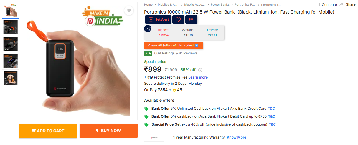 Portronics 10000 mAh 22.5 W Power Bank (Black, Lithium-ion, Fast Charging for Mobile).