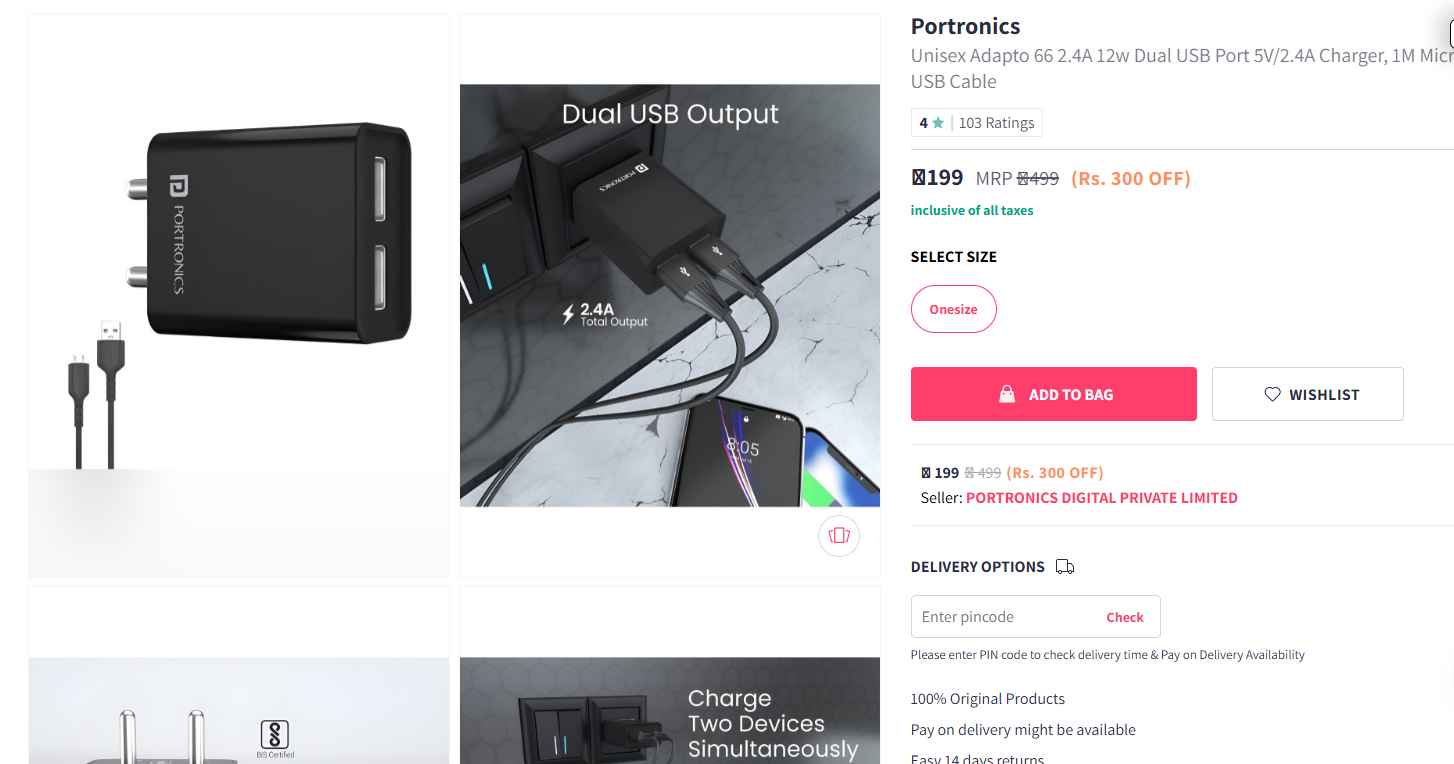 Portronics Unisex Adapto 66 2.4A 12w Dual USB Port 5V/2.4A Charger, 1M Micro USB Cable